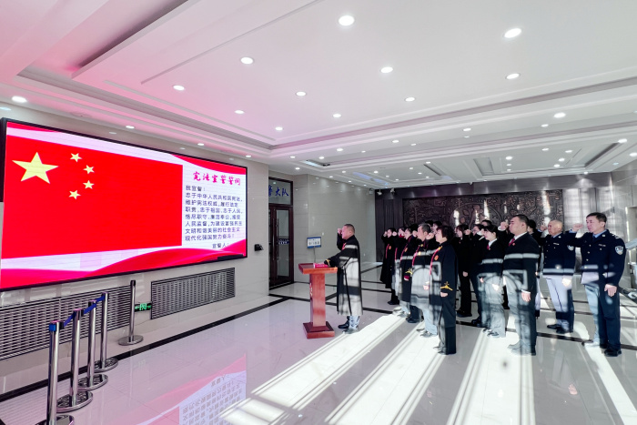 12月4日,在第十二个国家宪法日当天,友好区人民法院内国徽高悬、国旗庄严,《中华人民共和国宪法》文本整齐陈列于宣誓台,全体在院员额法官及干警身着制服、精神抖擞,一场庄重的宪法宣誓活动在此拉开帷幕,以司法人特有的方式致敬宪法、践行使命。 上午9时,宣誓仪式正式开始。党组成员、副院长杨春雷作为领誓人,左手抚按宪法,右手举拳过肩,以洪亮坚定的声音领诵誓词。“忠于中华人民共和国宪法,维护宪法..